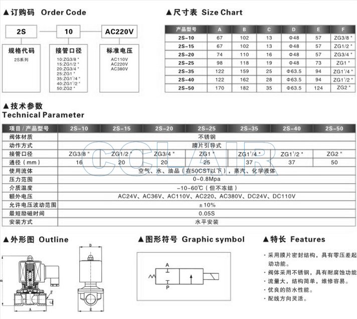 2S-06,2S-08,2S-10,2S-15,2S-20,2S-25,2S-35,2S-40,2S-50,不锈钢常闭流体电磁阀