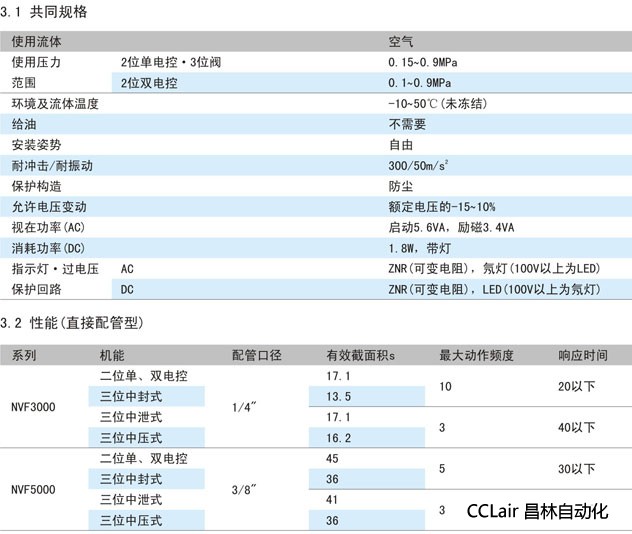 AC2100V~240V、介质为经过滤干燥的清洁空气、工作压力为0.15~0.9MPa。NVF3000、NVF5000系列电磁