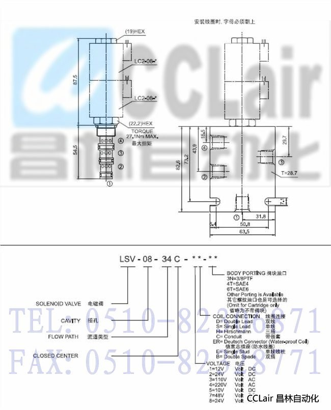 LSV-08-34C-7D,LSV-08-34C-7H,LSV-08-34C-7C,LSV-08-34C-7S,三位四通电磁阀,