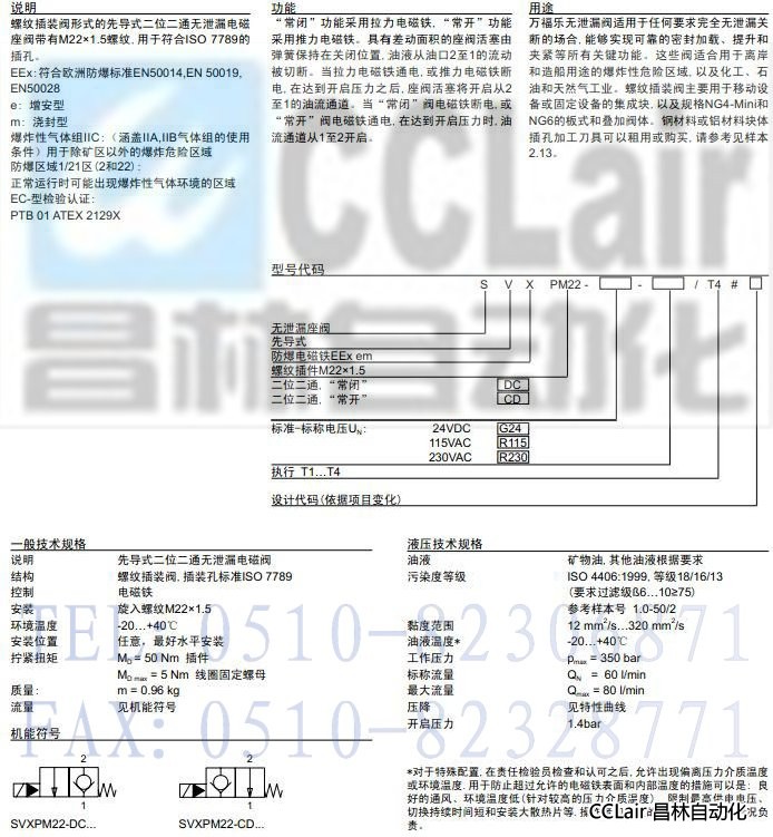SVXPM22-DC,SVXPM22-CD,先导式插装式防爆无泄漏电磁阀EEx em II