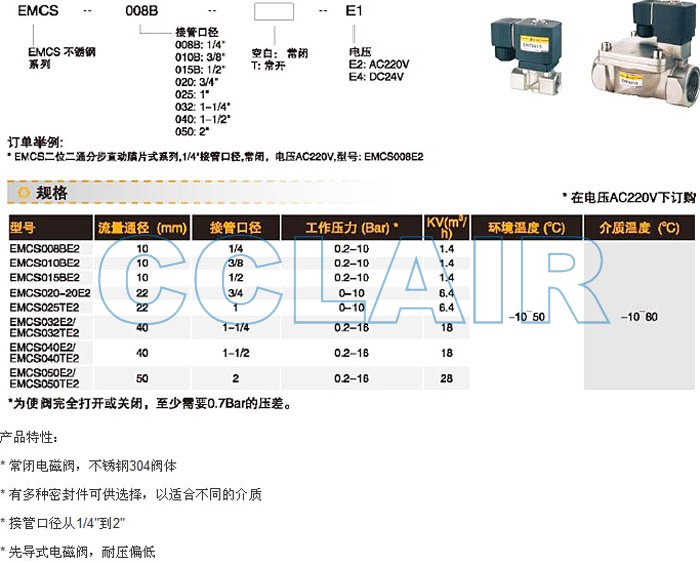 EMCS008BE2,EMCS010BE2,EMCS015BE2,EMCS020E2,EMCS025E2,EMCS032E2,不锈钢电磁阀